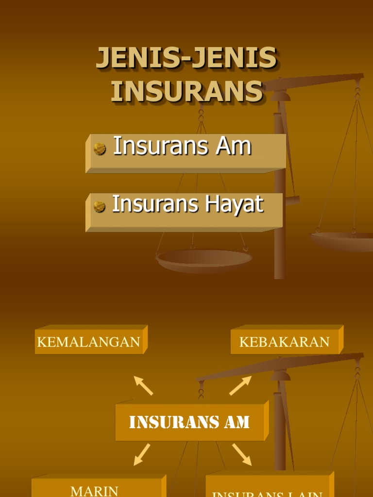 Jenis-jenis Insurans Jenis Insurans Am Hayat Kemalangan Kebakaran Marin dan penerbangan Lain-lain insurans. INSURANS adalah pemindahan risiko daripada seorang individu seperti anda atau sebuah organisasi seperti syarikat anda kepada syarikat insurans. Perlindungan yang sesuai adalah 3-5 tahun gaji.